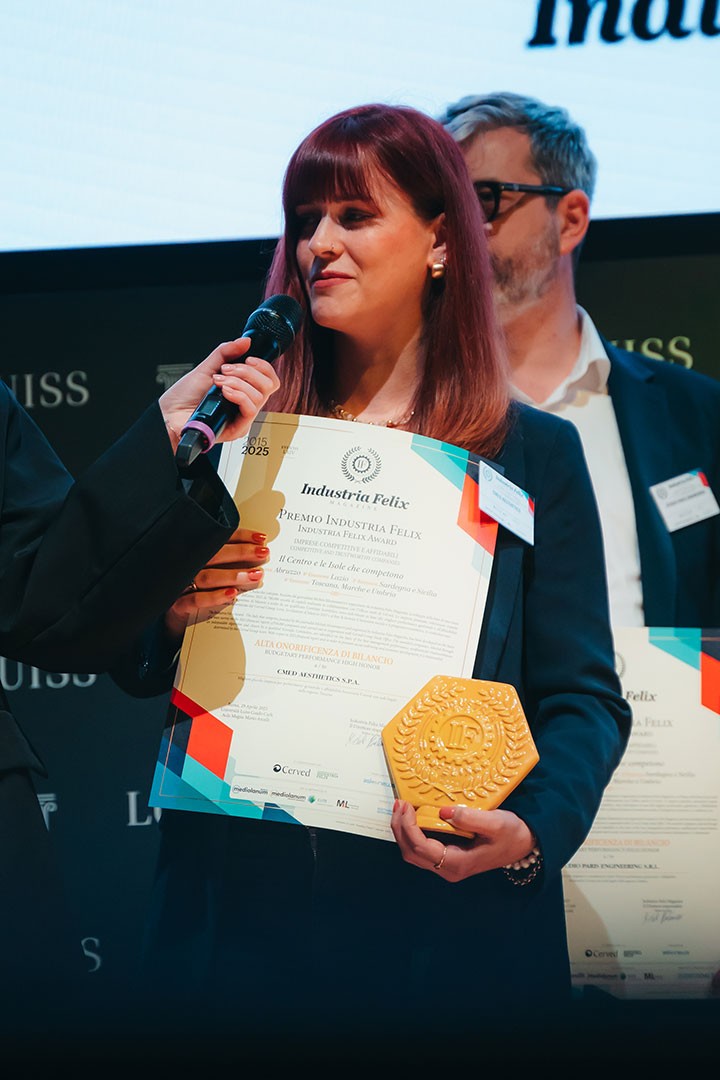 CMed Aesthetics is well pleased to announce that it has once again been awarded the prestigious Industria Felix Award, reaffirming its position as one of Italy’s most financially reliable and dynamically growing companies. The award ceremony took place on April 28, 2025, at the prestigious LUISS Guido Carli University in Rome.